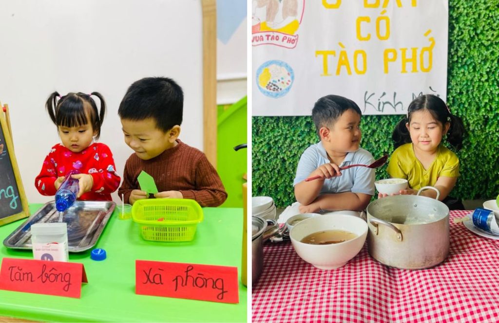 - Môi trường hoạt động nhóm thân thiện: Trẻ thường được xếp vào các nhóm nhỏ để cùng nhau xây tháp Lego, vẽ tranh tập thể hay đóng vai trong những trò chơi giả tưởng. Những trải nghiệm này không chỉ giúp trẻ học cách hợp tác mà còn thắt chặt thêm tình bạn qua từng phút giây sẻ chia.