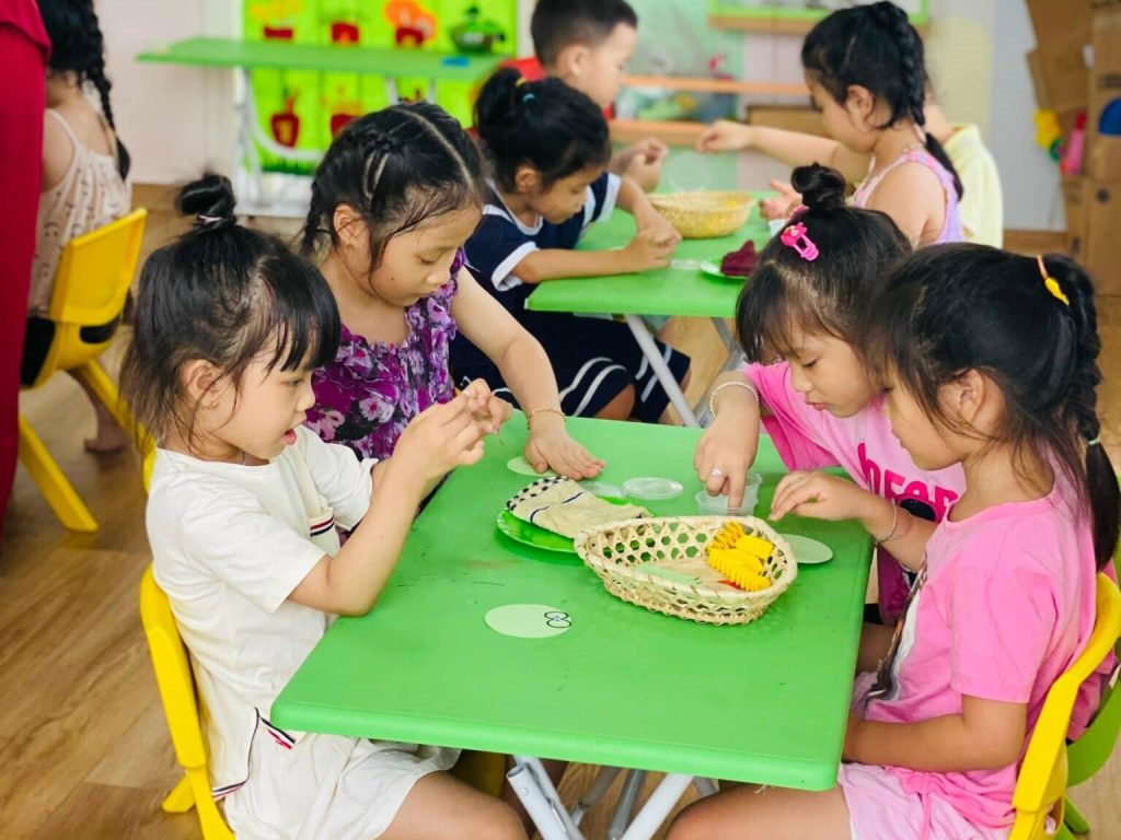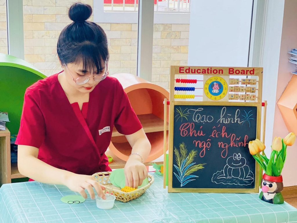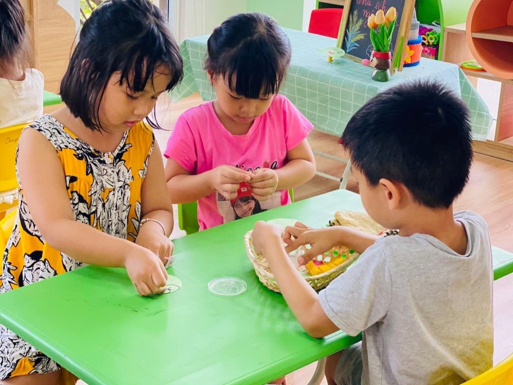 Hôm nay, lớp học Orange tràn ngập niềm vui và sự hứng khởi khi các bạn nhỏ tham gia vào hoạt động tạo hình với chủ đề “Tạo hình những chú ếch ngộ nghĩnh.” Đối với các con, ếch không phải là một loài vật xa lạ, nhưng việc tạo hình chúng trên bìa màu lại là một thử thách đòi hỏi sự sáng tạo, khả năng sắp xếp và bố cục hợp lý.